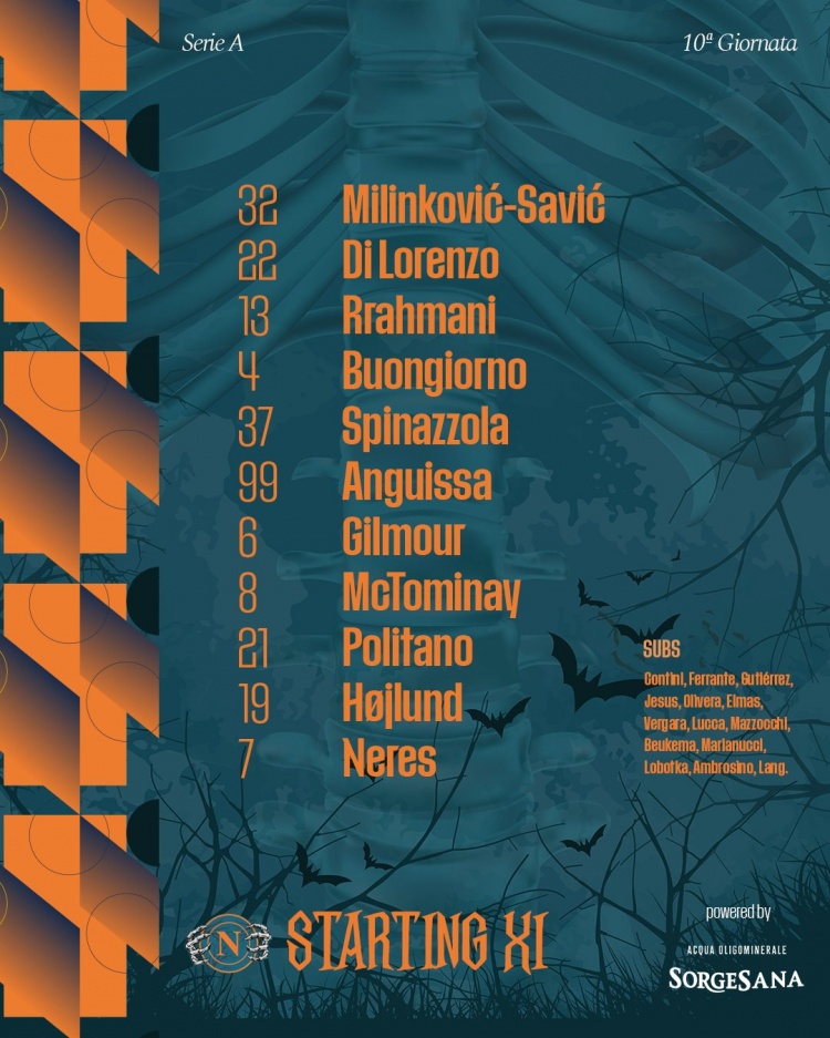 32-Milinkovic-Savic, 22-Di Lorenzo, 13-Rachmani, 4-Buongiorno, 37-Spinazzola, 99-Anguissa, 6-Gilmore, 8-McTominay, 21-Politano, 19-Hoylen, 7-Neres