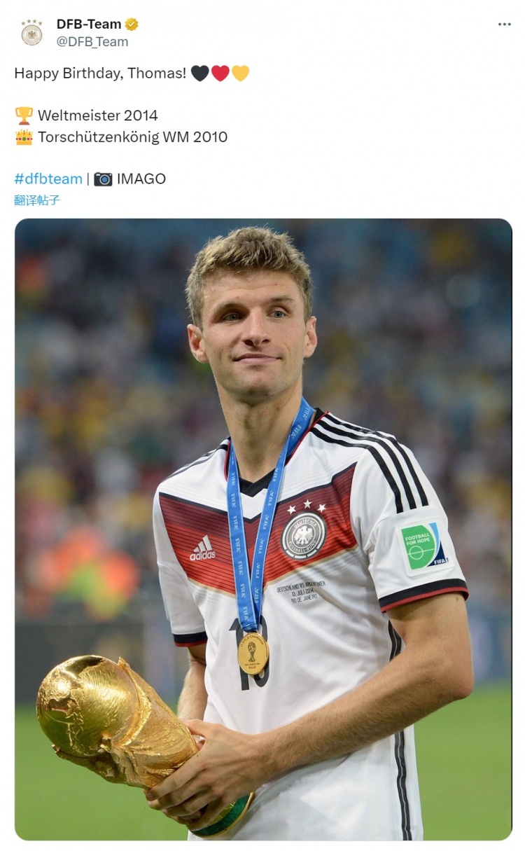 Nhóm người Đức đã đăng một bức ảnh của Mueller và Hercules Cup, với chú thích: "Chúc mừng sinh nhật, Thomas! Nhà vô địch World Cup 2014 và cầu thủ ghi bàn hàng đầu World Cup 2010".